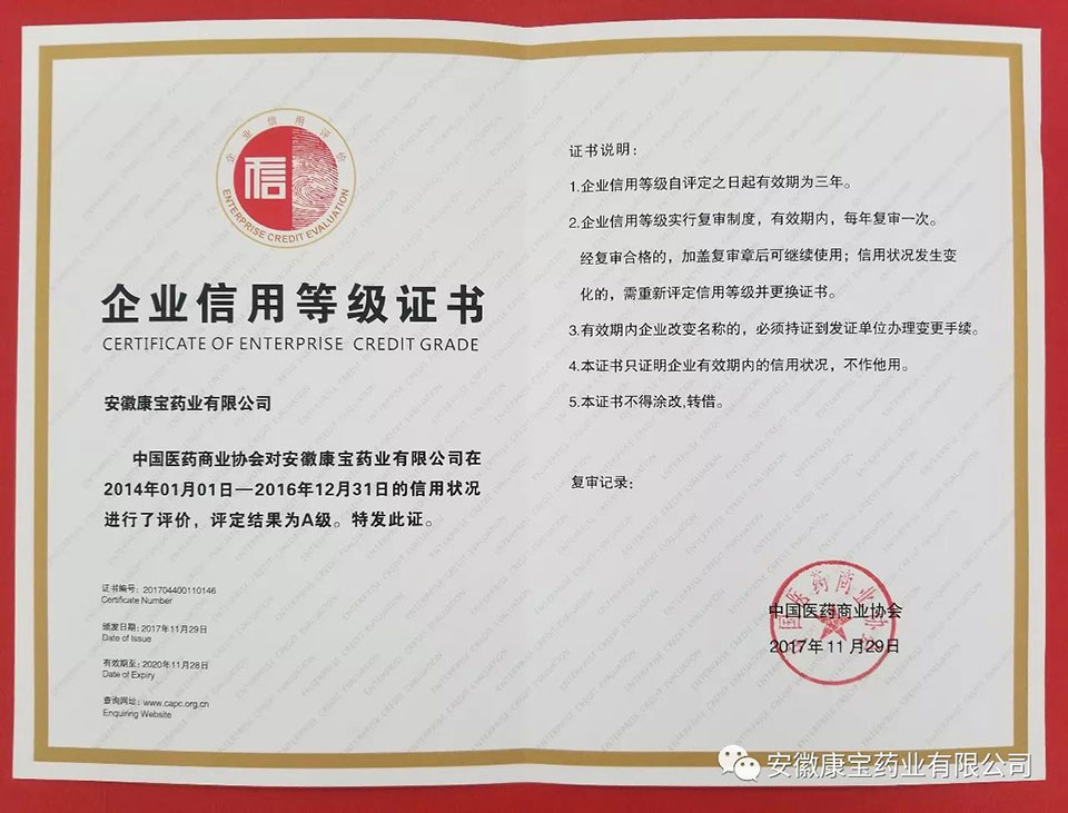 信以為本 “誠”就卓越--安徽康寶藥業(yè)有限公司榮獲A級企業(yè)信用評
