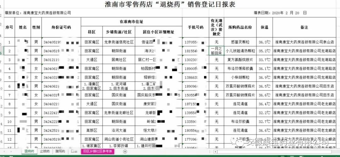 自2月5日起,質(zhì)管部每日協(xié)助康寶各門(mén)店對(duì)“退燒藥、止咳藥、腹瀉藥、口罩”的銷(xiāo)售情況實(shí)行登記報(bào)告,詳細(xì)登記購(gòu)買(mǎi)人的身份信息、居住地址、聯(lián)系方式、有無(wú)湖北(武漢)接觸史等,協(xié)助淮南市疫情防控中心開(kāi)展新冠肺炎疫情的全面排查和精準(zhǔn)摸排,為全市疫情防控工作提供了重要的信息支持。
